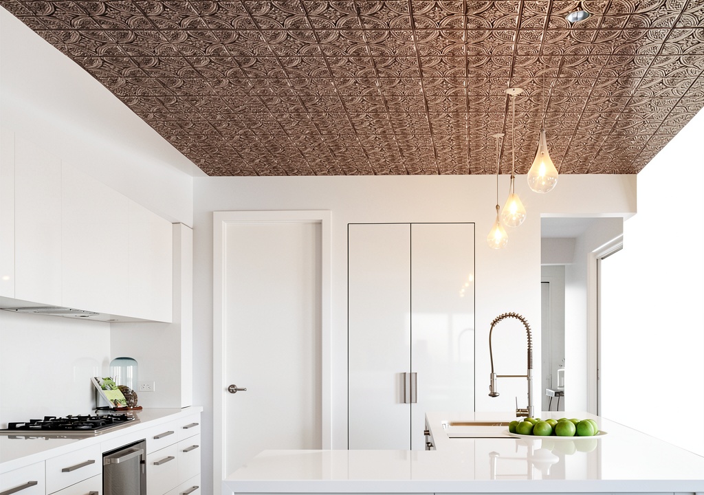 Silver tin peel and stick backsplash tile installed in a modern kitchen